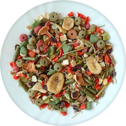 • Zutaten: Luzerne, Gemüse (Karotte, Rote Bete, Pastinake, Petersilie), extrudierter Weizen, extrudierter Mais, Erbsenflocken, Obst (Äpfel, Bananen), Johannisbrot, Hafer, Weizenflocken