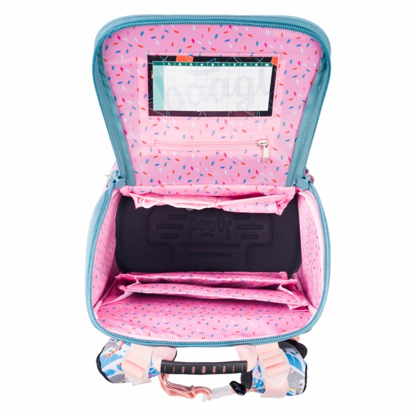 • Aktentascheund verfügt über ein neues Klappöffnungssystem, das es Schulkindern erleichtert, direkt vom Schreibtisch aus auf ihre Hilfsmittel zuzugreifen.