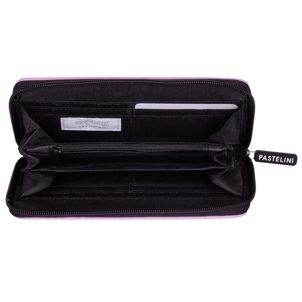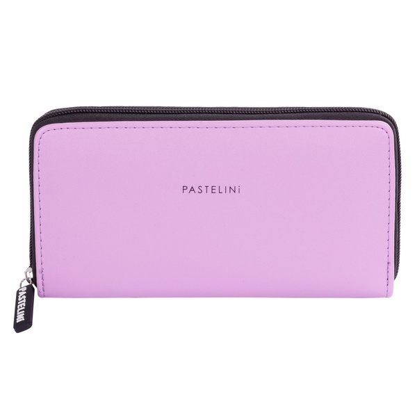 Große Damenbrieftasche im lila Design. Im Inneren befinden sich 8 kleinere Fächer für Kundenkarten, 2 größere Fächer, 3 separate Fächer für Bargeld und 1 Reißverschlussfach für kleine Münzen.