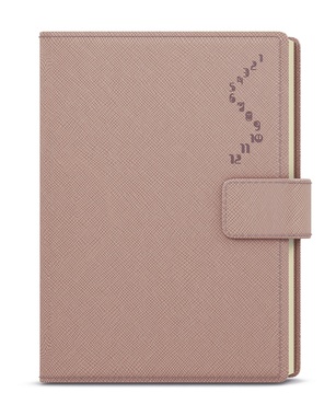 Luxusní denní diář formátu A5, který má znovupoužitelný obal v pudrové barvě. Obal má mnoho přihrádek na vizitky, poutko na tužku a vše je uzavřeno magnetem. Univerzální ražba je velmi stylová. jemný hladký materiál s lesklým povrchem, ražba, oboustranná pěnová výplň desek, obšití v barvě potahu, magnetická přezka, poutko na tužku, 3 vnitřní kapsy, šitá vazba V8, kapitálky, stužka, perforované rožky, ručně vyráběné desky + papírová manžeta, ofset, 70g/m2, krémový papír, indexové výseky