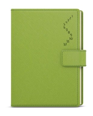Luxusní denní diář formátu A5, který má znovupoužitelný obal v zelené barvě. Obal má mnoho přihrádek na vizitky, poutko na tužku a vše je uzavřeno magnetem. Univerzální ražba je velmi stylová. jemný hladký materiál s lesklým povrchem, ražba, oboustranná pěnová výplň desek, obšití v barvě potahu, magnetická přezka, poutko na tužku, 3 vnitřní kapsy, šitá vazba V8, kapitálky, stužka, perforované rožky, ručně vyráběné desky + papírová manžeta, ofset, 70g/m2, krémový papír, indexové výseky