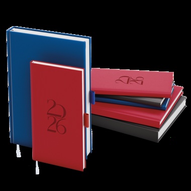 Denní diář z jemně strukturovaného materiálu s poutkem je vyráběný ve formátu A5 s prostorem pro plánování a poznámky. jemně strukturovaný materiál, ražba roku, jednostranná pěnová výplň desek, šitá vazba V8, stužka, perforované rožky, mapa ČR a SR, vlepená kapsa, poutko v barvě, ofset, 70g/m2