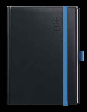Denní diář v černé barvě z jemné vivelly ve formátu A5 s praktickou gumičkou a poutkem na propisku. Má velký prostor pro poznámky a plánování. jemný hladký materiál, ražba roku, jednostranná pěnová výplň desek, šitá vazba V8, stužka, kapitálky, perforované rožky, mapa ČR a SR, vlepená kapsa, gumička a poutkoofset, 70g/m2