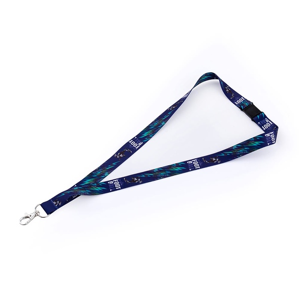 Schlüsselanhänger um den Hals mit Aufdruck, Karabiner am Ende.