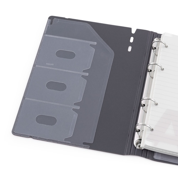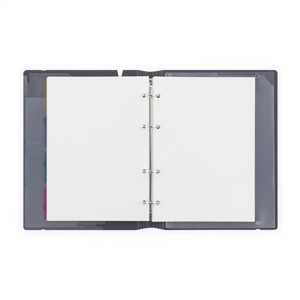 Blok obsahuje praktické rozřazovače a kombinaci různých typů stránek – 30 stran linka, 30 stran tečka a 30 stran čtvereček. Uzavírá se pomocí elastické gumičky a nabízí i kapsy pro vizitky.