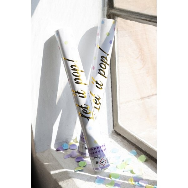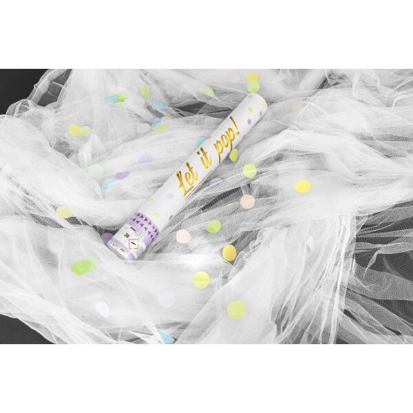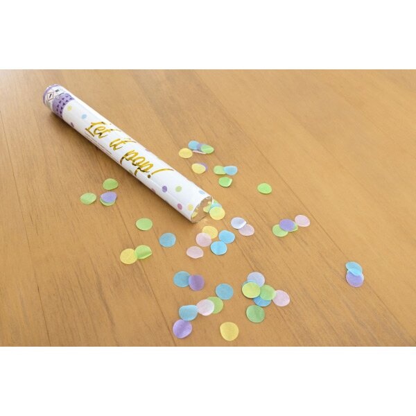 Vystřelovací barevné konfety v tubusu o délce 40 cm. Vyrobeno z hedvábného papíru. Perfektní doplněk pro oslavy a párty.