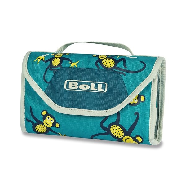 Der türkisfarbene Boll Kinder-Kulturbeutel verfügt über 3 praktische Taschen und eine Schlaufe zum Aufhängen mit Affenmotiven.