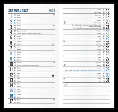 Jednoduchý a praktický měsíční diář vyrobený z jemného hladkého materiálu s polomatným povrchem modré barvy. Ideální pro každého, kdo si oblíbil měkkou šitou vazbu. jemný hladký materiál PVC,potisk roku bílou barvou, šitá vazba V1, ofset, 70g/m2
