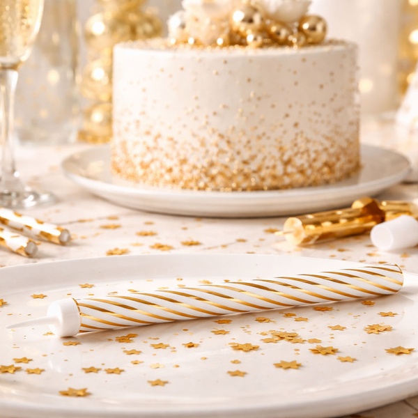 Party Tortenfontäne 12 cm mit goldenen Streifen ist eine stilvolle Dekoration für Geburtstagstorten, Desserts und festliche Anlässe. Nach dem Anzünden entsteht ein funkelnder Effekt, der jede Feier besonders hervorhebt.