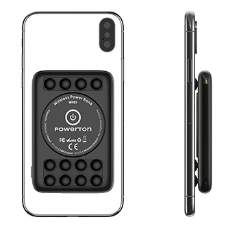 Kabellose Powerbank Powerton WBP5 mit einer Kapazität von 5.000 mAh ermöglicht kabelloses und kabelgebundenes Laden. Dank dreireihiger Gummisaugnäpfe lässt es sich einfach am Telefon befestigen. Seine geringe Größe blockiert die Kamera nicht, sodass Sie sogar während des Ladevorgangs aufnehmen können.