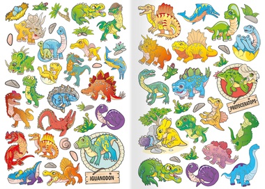 8 tematických stran samolepek s dinosaury, jejich prostředím a doplňky (stopy, vejce, sopky, rostliny) pro dotvoření pravěkých scén.