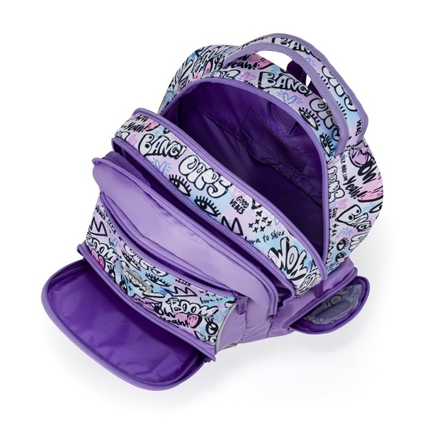 Innentaschen bieten viel Platz für Schulbücher, Hefte und andere Schulmaterialien. Ein wasserdichter Boden schützt den Inhalt vor Schmutz und Auslaufen. An den Seiten befinden sich zwei Taschen – eine mit Reißverschluss und eine offene, z. B. für eine Trinkflasche. Reflektierende Elemente erhöhen die Sicherheit des Kindes auf dem Schulweg. Das Set enthält außerdem: Tasche – praktisch für Sport oder Freizeit, mit Kordelzug. Federmäppchen mit zwei Fächern – mit Schlaufen für Stifte und einer transparenten Folie für den Stundenplan.