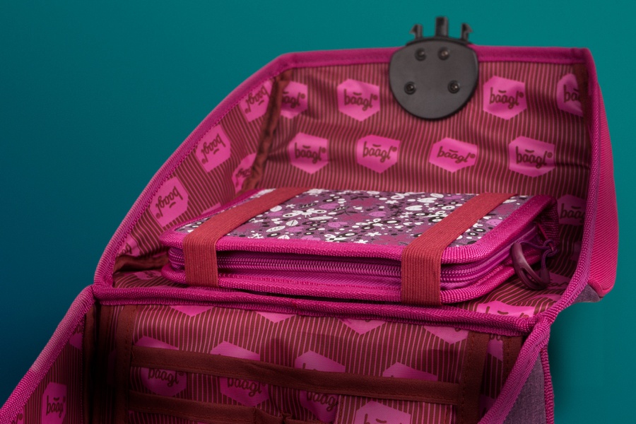 • Auf der Klappe der Aktentasche befindet sich ein praktischer elastischer Griff für ein Federmäppchen, der immer einen schnellen Zugriff auf die Schreibanforderungen jedes Schülers bietet.