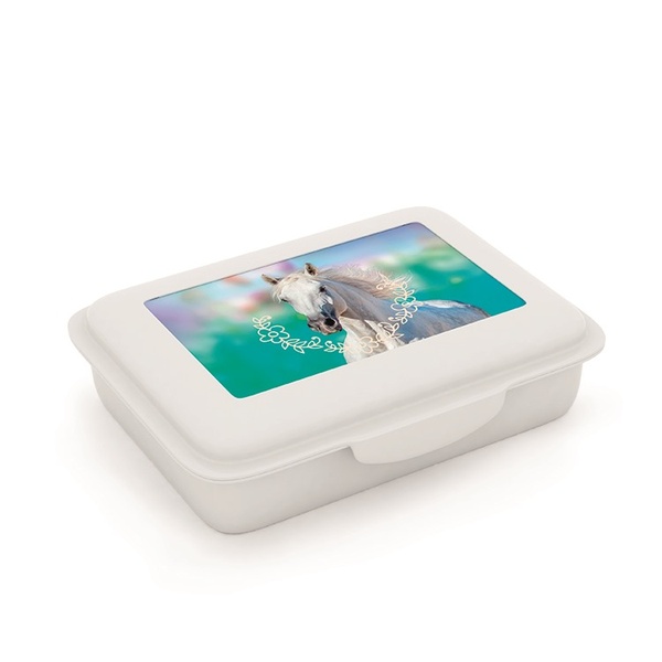 Volltext →Snackbox aus Kunststoff mit Pferdemotiv.