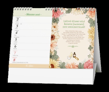 Stolní kalendář s týdenním kalendáriem a s radami z domácí lékárny od paní Renaty Raduševy Herber. Papír: G print, 100 g/m2 Obálka: křída lesk 135 g/m2 Stojánek je z kvalitní bílé lepenky 600g/m2 Dělená kovová spirála "twin wire"