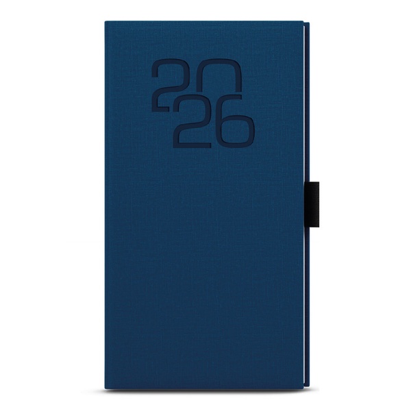 Kapesní týdenní diář z příjemného materiálu v modré barvě a s moderní ražbou roku. Trendy a praktický doplněk do každé kapsy. Diář má velký prostor pro poznámky a plánování. strukturovaný materiál, šitá vazba V8, ražba roku, poutko na tužku, stužka, perforované rožky, ofset, 70g/m2