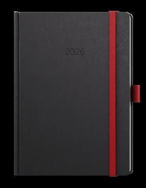 Neobyčejný týdenní diář s matným povrchem ze strukturovaného materiálu s červenou gumičkou a poutkem. Je vyráběný ve formátu A5, má velký prostor pro poznámky a plánování. pololesklý, jemně strukturovaný materiál, ražba roku, gumička a poutko, stužka, kapitálky, perforované rožky, mapa ČR a SR, vlepená kapsa, kulaté rohy