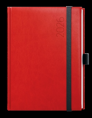 Týdenní diář v červené barvě z jemné vivelly ve formátu A5 s praktickou gumičkou a poutkem na propisku. Má velký prostor pro poznámky a plánování. Volltext →