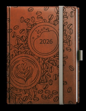Týdenní diář v oblíbené vivelle s hnědou celoražbou s motivem Kávových zrn. Diář v oblíbeném formátu s velkým prostorem pro poznámky a plánování. jemný hladký materiál, celoplošná ražba motivu včetně ražby roku, šitá vazba V8, stužka, gumička, poutko na propisku, perforované rožky, vlepená kapsa, ofset, 70g/m2